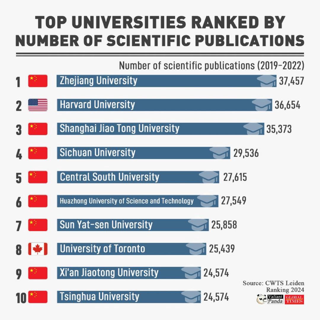 8 out of top 10 universities with the highest number of scientific publications are from China🇨🇳, according to CWTS Leiden Ranking 2024 from Netherlands.